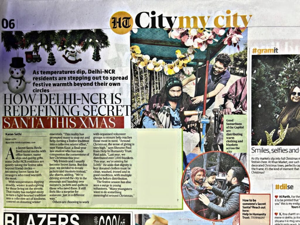 दिल्ली-NCR की ठंडी सड़कों पर, Help in Humanity Trust ने असली Secret Santa बनकर ज़रूरतमंदों तक गर्म कपड़े, कंबल और उम्मीद पहुँचाई। यह सिर्फ एक सेवा नहीं, बल्कि सम्मान और संवेदनशीलता के साथ इंसानियत को ज़मीन तक पहुँचाने की पहल है — जिसे हिंदुस्तान टाइम्स ने भी सराहा।