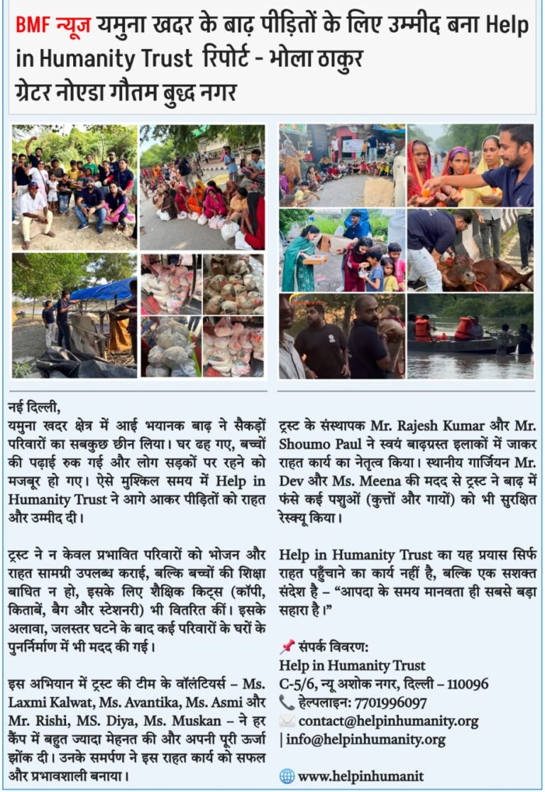 यमुना खादर क्षेत्र में आई भीषण बाढ़ के बाद Help in Humanity Trust ने प्रभावित लोगों के लिए उम्मीद की किरण बनकर तत्काल राहत कार्य शुरू किया। बाढ़ से बेघर हुए सैकड़ों परिवारों को भोजन सामग्री, राहत किट और आवश्यक सामान वितरित किया गया, ताकि वे इस कठिन समय में सुरक्षित रह सकें। ट्रस्ट ने केवल राहत तक ही सीमित न रहते हुए बच्चों की शिक्षा को भी प्राथमिकता दी और कॉपी-किताबें, स्टेशनरी व शैक्षणिक किट प्रदान कीं, जिससे आपदा के बाद भी उनकी पढ़ाई बाधित न हो। इसके साथ-साथ, बाढ़ से प्रभावित पशुओं—विशेषकर गायों और कुत्तों—को सुरक्षित निकालकर उनकी देखभाल की गई। Help in Humanity Trust के इस मानवीय प्रयास को BMF News Network जैसे प्रतिष्ठित मीडिया प्लेटफॉर्म द्वारा प्रमुखता से प्रकाशित किया गया, जो ट्रस्ट की निष्ठा, पारदर्शिता और ज़मीनी स्तर पर किए गए कार्यों का प्रमाण है। यह अभियान केवल राहत कार्य नहीं, बल्कि यह संदेश भी था कि “आपदा के समय मानवता ही सबसे बड़ा सहारा होती है।”