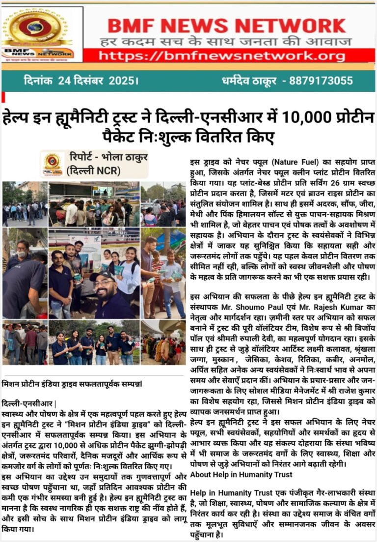 We sincerely thank Hindustan Times – City My City for featuring and highlighting the humanitarian efforts of Help in Humanity Trust. Your platform has given voice to compassion and helped bring attention to the spirit of kindness spreading across Delhi-NCR.This recognition not only motivates our volunteers but also inspires more people to step forward and serve humanity with dignity and empathy. We are grateful for your continued support in amplifying stories that truly matter.